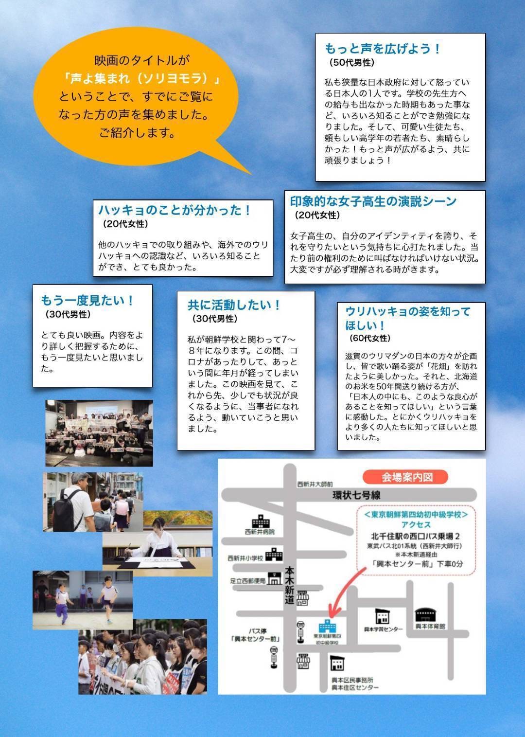 来場者アンケートには多くの感想が寄せられ、「国籍を理由に受験を拒否された世代として、善良な日本の方々の支援を見て救われた気分です」、「困難な中で教育をしておられる先生方、父兄の方々に敬意を表します。またそれを支援する日本の方も応援したいと思います。映画を観て学べて良かったです」といった声がありました。