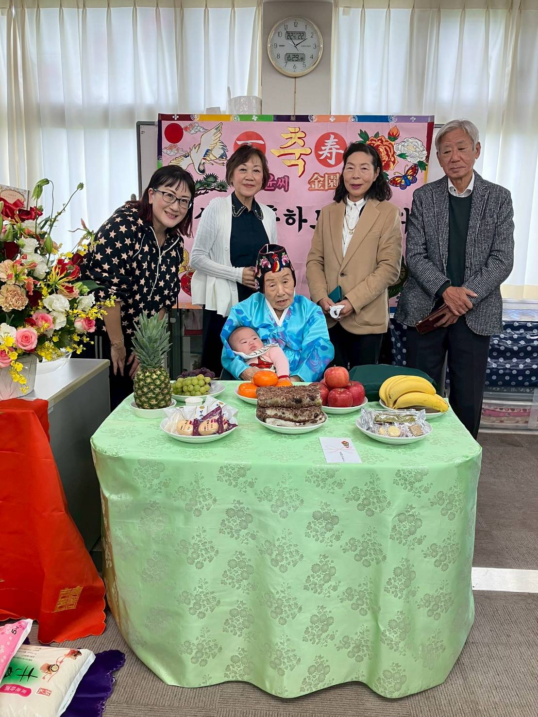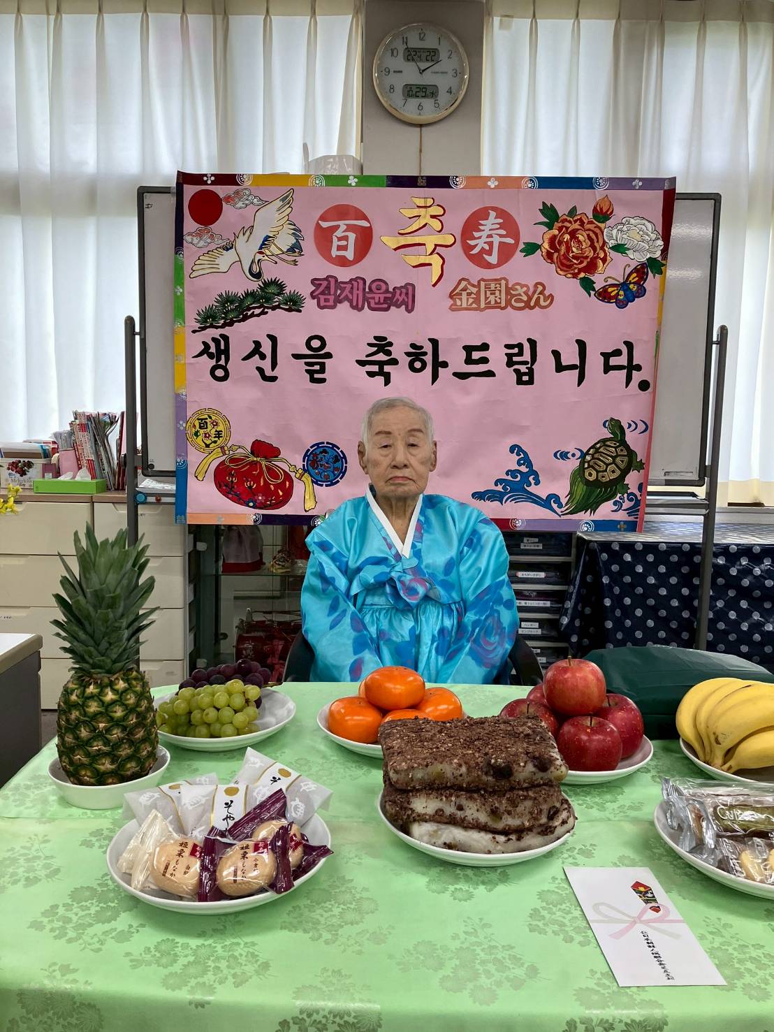 10月29日、デイサービスセンター朝日にて金在允オモニムの百寿をお祝いする会が行われました。