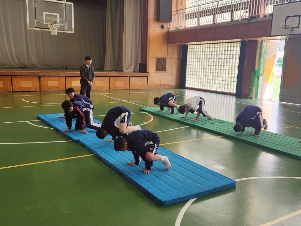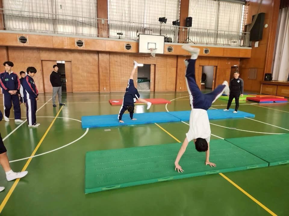 要望が多かった、側転、ロンダード、補助付きでのバク転など、出来なかった、やってみたいことに対して、分かりやすく説明及び実践出来て、生徒達も意欲的に授業に取り組んでいました。
