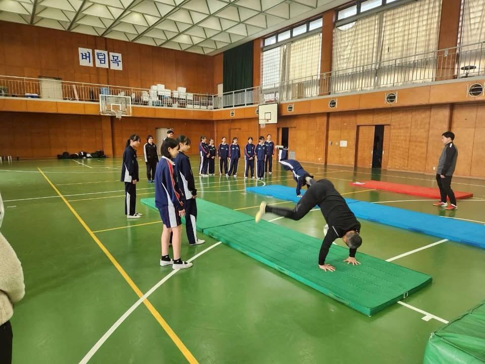 授業2時間を使い、男女で授業分けを行い、片方が리창수先生のマット運動、片方が大学の生徒主導の運動をそれぞれ体育館と運動場を使い行いました。