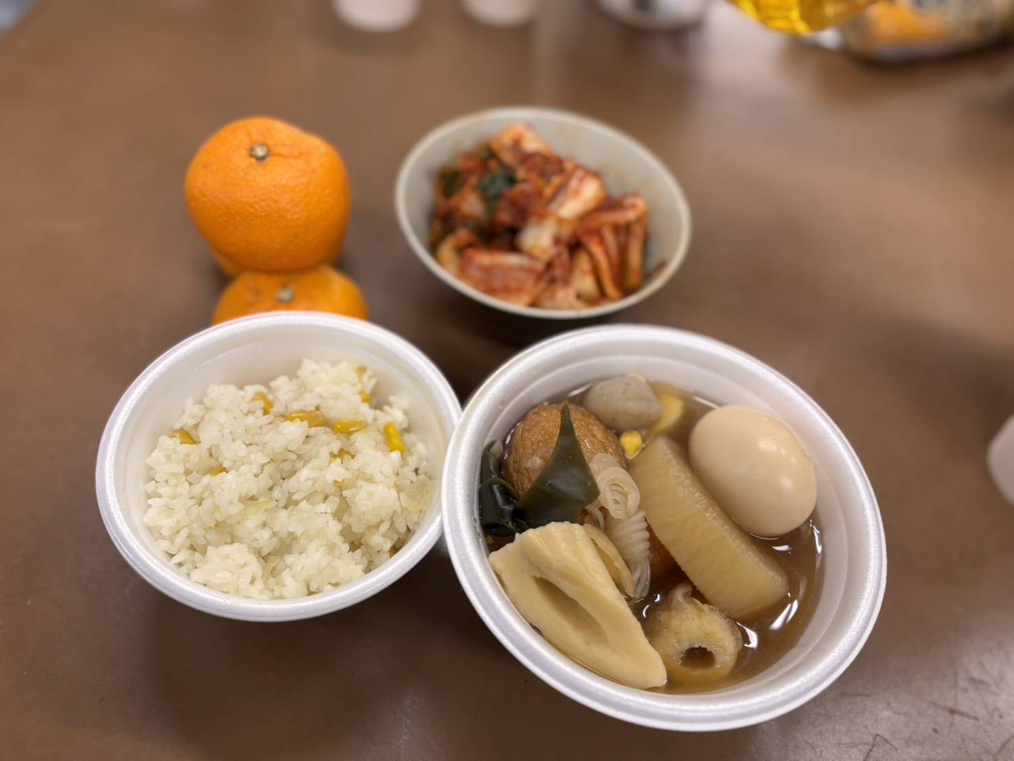 メニューはおでん9種、バターコーンライス、キムチ、みかんです。